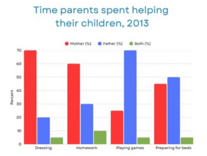 Around 70% of mothers assisted their children with dressing, compared to only 20% of fathers. A similar pattern appeared in helping with homework, where about 60% of mothers and 30% of fathers were involved. Only a small proportion, roughly 5–10%, of both parents helped together in these tasks.