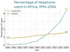 In 1994, only 0.06% of Africans used mobile phones, compared to around 1.7% using fixed lines. Mobile use remained minimal until 1998, after which it began rising sharply. By 2000, mobile subscriptions equalled fixed-line levels at roughly 2%, and this figure continued to soar to almost 9% by 2004.