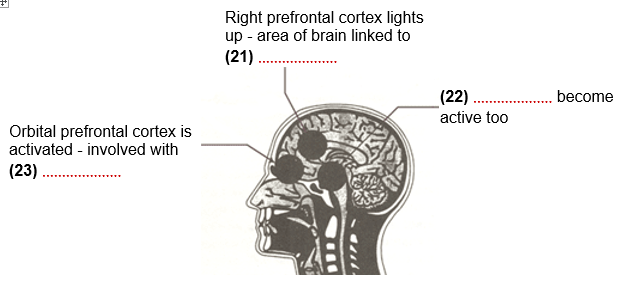 Although Goel felt being inside a brain scanner was hardly the ideal place for appreciating a joke, he found evidence that understanding a joke involves a widespread mental shift. His scans showed that at the beginning of a joke the listener’s prefrontal cortex lit up, particularly the right prefrontal believed to be critical for problem solving. But there was also activity in the temporal lobes at the side of the head (consistent with attempts to rouse stored knowledge) and in many other brain areas. Then when the punchline arrived, a new area sprang to life -the orbital prefrontal cortex. This patch of brain tucked behind the orbits of the eyes is associated with evaluating information.